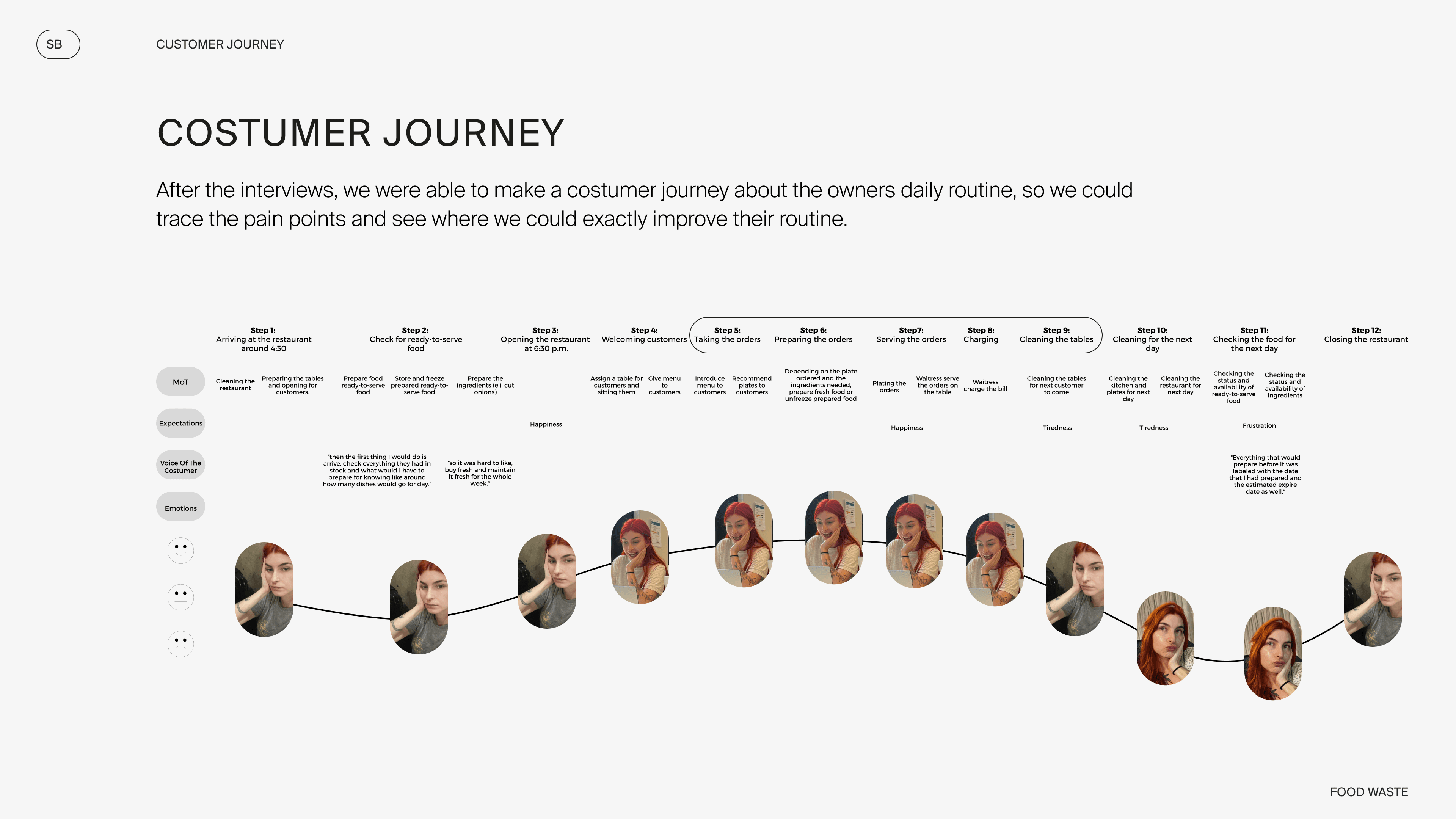 After conducting interviews with three restaurant owners, we mapped out a customer journey, allowing us to understand their daily operations, identify key pain points, and gain insights into how we could improve their workflow.